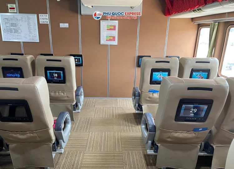 Đội tàu cao tốc đi Côn Đảo thuộc Phú Quốc Express được trang bị tiện nghi hiện đại chuẩn 5 sao. Khoang VIP có màn hình giải trí, tai nghe không dây, cổng sạc USB và ghế bọc da ngả 130 độ thư giãn. Khoang phổ thông rộng như đi máy bay, ghế ngồi ngả lưng nhẹ và có vách chống ồn. Ngoài ra còn có boong tàu rộng để ngắm cảnh, wifi miễn phí, máy lạnh, nhà vệ sinh hiện đại…