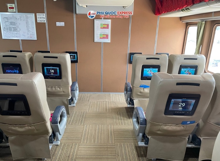 - Tiện nghi trên tàu: Tàu Phú Quốc Express được trang bị các tiện ích hiện đại như: ghế ngồi bọc da êm ái, có độ ngả cùng hệ thống điều hòa, màn hình giải trí, cổng sạc USB… giúp hành khách thư giãn trong suốt hành trình. Khoang VIP được thiết kế đặc biệt cho những hành khách yêu cầu không gian riêng tư và thoải mái.