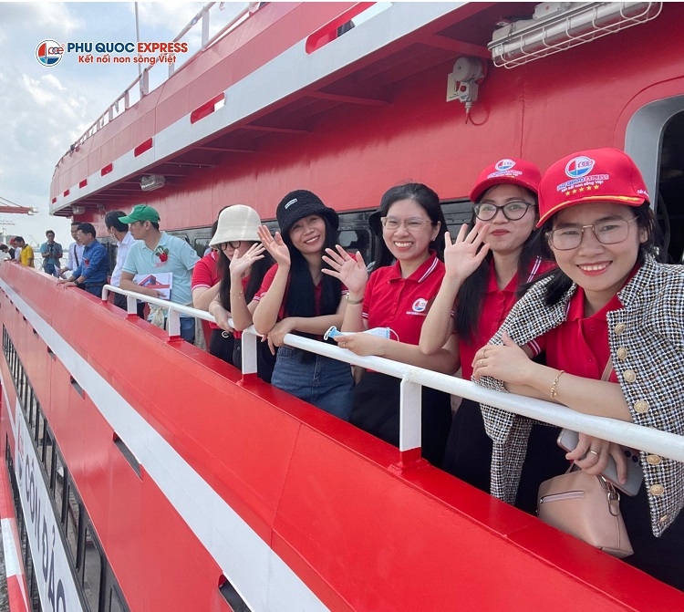 - Dịch vụ tiện nghi và thoải mái: Đội tàu Đỏ thuộc Phú Quốc Express có nội thất hiện đại, ghế ngồi êm ái, có máy lạnh, tivi giải trí, wifi... Boong tàu ngoài trời có sức chứa lớn với 50 hành khách ngắm cảnh biển đảo và check-in.